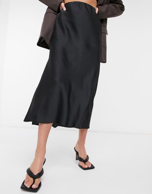 Asos Design Satin Bias Slip Midi Skirt In Black Asos